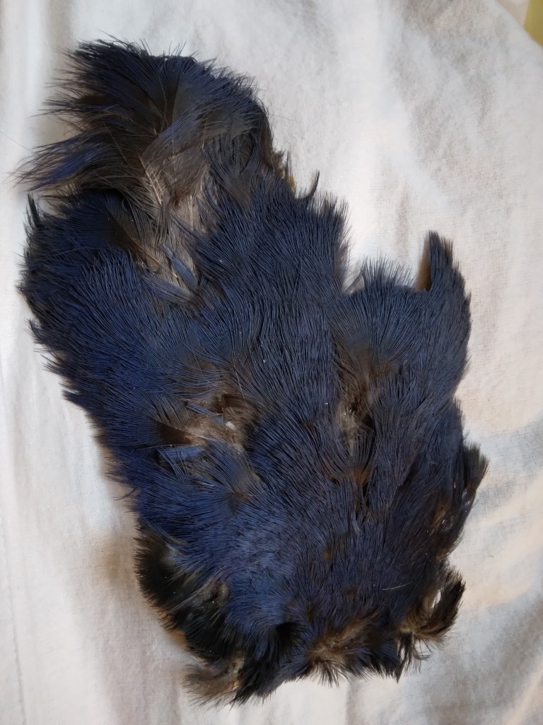 I was intrigued by these feathers! The photo was unclear but they appeared to be blue/black in colour and around the right size for use on size 8 or 10 flies. Out of curiosity more than anything I bid and won the lot (the skin patch was part of a small job lot which had some other useable capes in it). I have had the weird feathers for a couple of weeks now and I still have no idea what they are. The colour is natural, not dyed and the feathers are plain, not barred or speckled in any way.