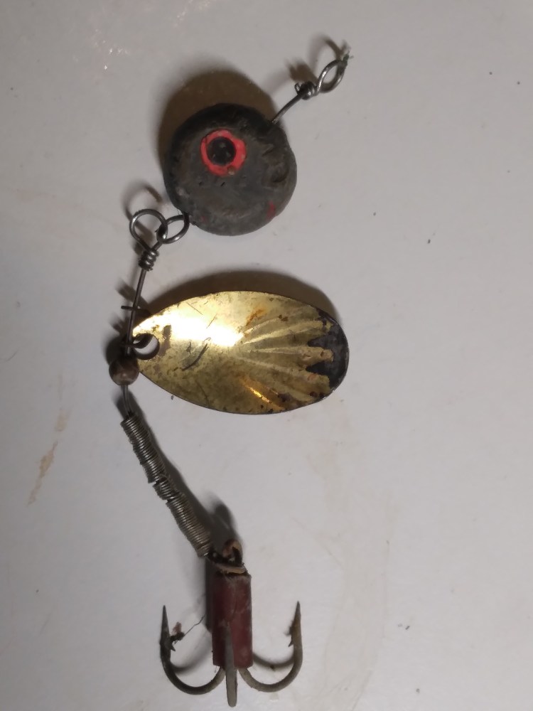 Maybe 20 minutes slipped away before the float wiggled and dipped, resulting in a nice roach coming to hand. Two more fell off then a somewhat smaller roach snaffled my maggots. All this time I had been periodically winding in the leger, re-baiting with fresh corn then casting it back out again. No fishy bites on the bottom rig so far, but I did catch something on the leger. While winding in to check the bait I snagged on the bottom. Not an unusual occurrence when bottom fishing but there was something not quite right. when I applied a bit of pressure I was able to recover a little line. Some gentle persuasion eventually led to whatever I had hooked giving up and I was able to recover all my tackle. Wrapped around my hook was a length of heavy line, so I tugged at it until out came 20 yards on old mono and a homemade lure of some sort. I tucked the line and lure into may bag for safety and examined it closely when I got home. Twisted wire held a clevis, on which was mounted a gold size 2 blade. On the end was a treble hook and some lead wire had been wrapped on too. The interesting thing for me though was the articulated head which was a flattened ball of lead on a seperate piece of wire. It is clear that a bit of work had gone into making this lure and I am left wondering if it had caught any fish? I don’t think I will be adding it to my own lue box, but it is interesting to see what other fishers are using.