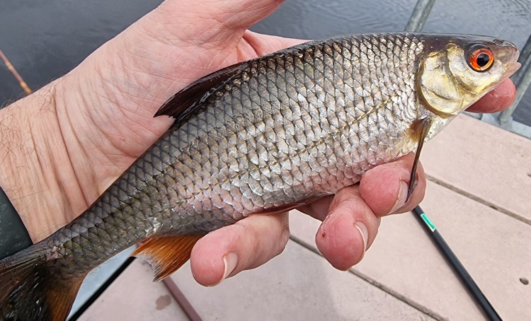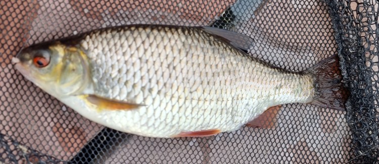 A few cruisers were moored up to the pontoon, the one closest to me sporting a french tricolor which fluttered daintily in the wind. Pleasantries were exchanged with the occupants, then a dog walker and finally with a couple who were just out for a stroll. All the while my craftily presented maggots on size 18 hooks were studiously ignored by the fish. I ate a sandwich and pondered my options. Perhaps I would have been better trying a spot further down river? In the end I decided to stick it out where I was. Maybe an hour passed before the first knock came, but I missed that one. Twenty minutes later I missed another one and I was beginning to think I was even rustier that I had I hoped to be. The third bite hooked itself with no intervention on my part and a lovely roach came to hand.