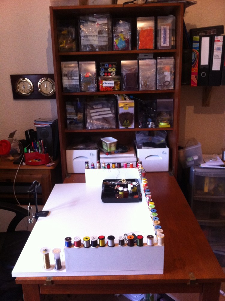 The tiny flat we bought in Bridge of Don was fully furnished. It was pretty poor quality stuff in general but one piece of furniture stood out for me. An ugly looking press which unfolded as a table stood in the minute living room. It really was an awful looking thing and most of the neighbours in the surrounding flats got rid of it at the earliest opportunity. When we moved away to Ayrshire I took the horrid press/table with me and when we finally settled into the house in Ayr it became my fly tying station, a role it has fulfilled to this day. Much battered and chipped, it has seen the creation of many thousands of flies over the decades. All my materials are stored on its shelves and the table part is the perfect height for my vice. I have added small containers for holding various materials and periodically I rearranged things to try and make it more ergonomically friendly. As ugly as it is, this press was a godsend to me and it gave me a lifetime of joy (see below)