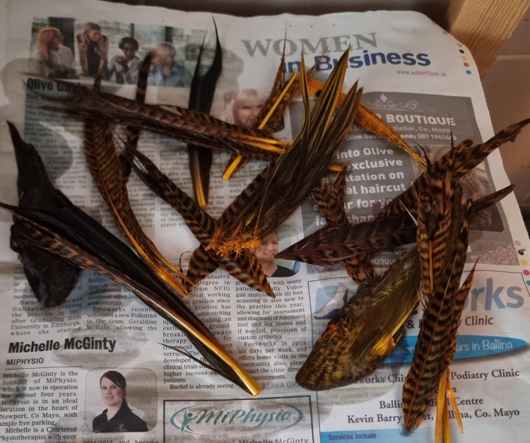 Step 4. Now for the tedious part if you are dyeing loose feathers. These will be in a soggy jumble in the sieve, so they need to be removed and placed on newspaper to dry. The tedium is when you have to straighten the feathers so they do not dry crooked. This is easy with capes but time consuming with individual feathers. Once laid out, leave the feathers to dry naturally, about an hour for small individual feathers, many be a day or two for capes or whole wings.