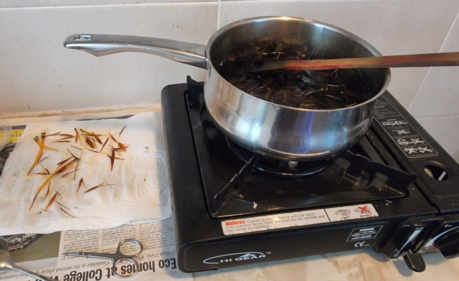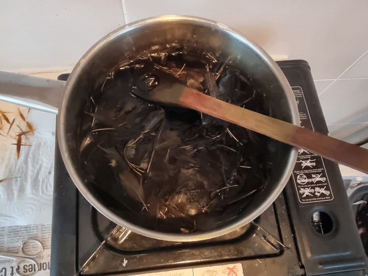 Step 3. Add the mordant immediately you have reached the right colour. This fixes the dye to the feathers, so don’t be shy with the vinegar. Be warned, the smell is pretty repulsive. Stir for another minute or so then pour the contents of the pan through a sieve and let the water run down the drain of the sink. Your materials are now safely in the sieve and can be thoroughly washed under a running cold water tap.