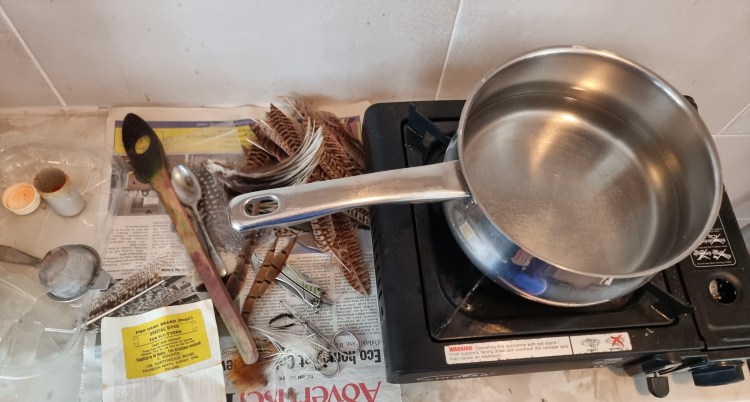 Step 2. Heat some water in a pan. How much will depend on the quantity of materials you are dying. Keep it to the minimum, no point in diluting the dye too much. Once it boils, turn the heat down and give it a stir before adding the dye. Dyes are very concentrated so be careful not to add too much. A quarter of a teaspoon will do you for a few feathers or a single cape. Gently stir the pan to keep the materials moving and not sticking to the bottom and also to allow the dye to spread evenly across the materials. Do not be alarmed at the colour of the water! It will bear no relation to the final colour you are wanting, so don’t panic. How long to keep the materials in the dye will vary a lot. Check frequently by holding a feather up to the light. Most dyes are made up of three different colours, each will take to the feathers at a different rate. I find the colours change rapidly with some dyes and more slowly with others, so be vigilant.