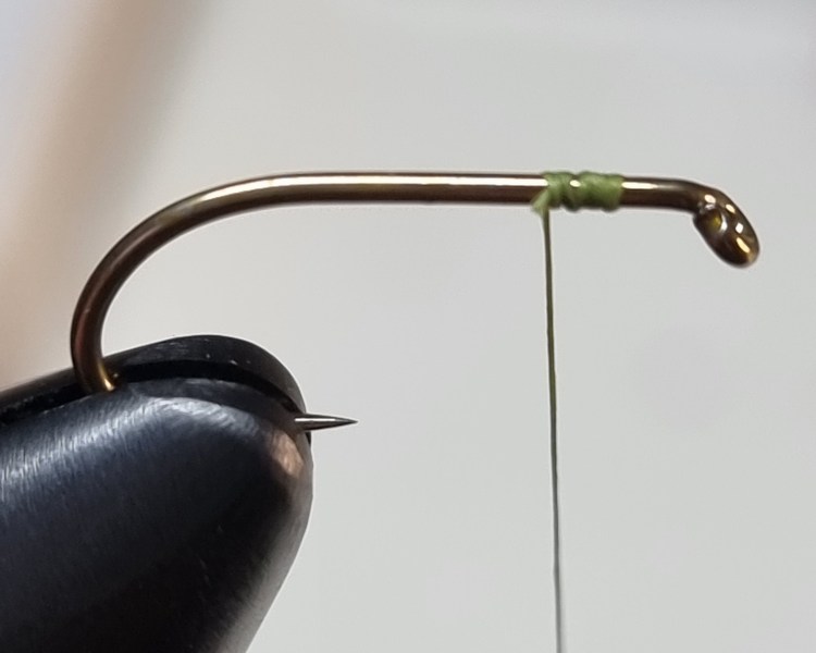 Tying silk: olive. Use a fine thread, I like 8/0 but you could go down to a 12/0 or 14/0 if desired. Remember to wax the silk thoroughly.