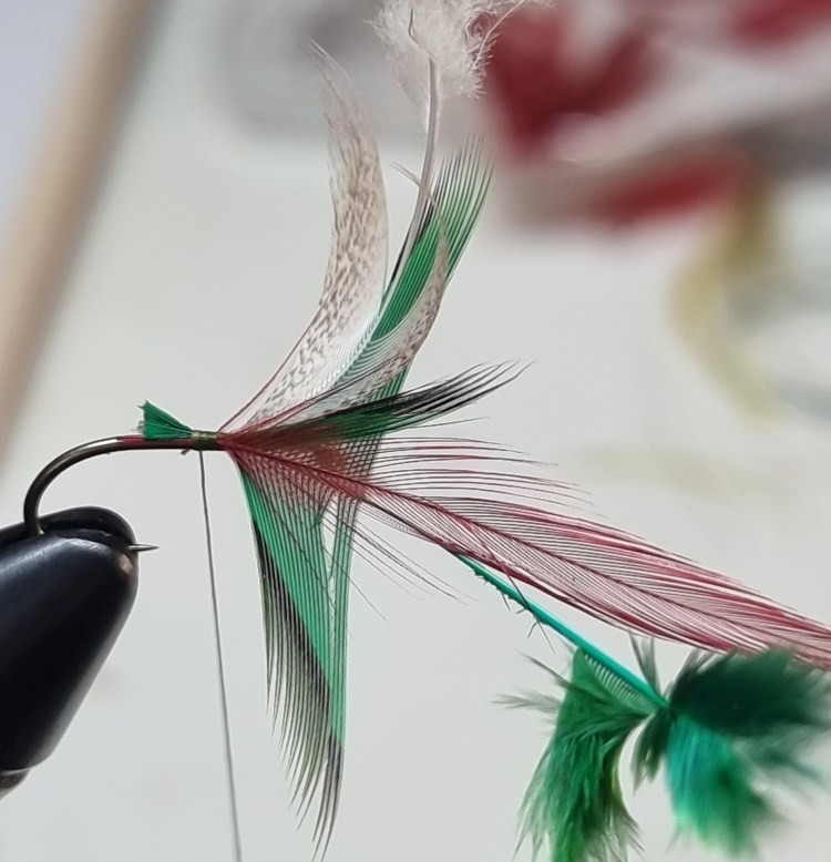 There is absolutely nothing to be frightened of when tackling this fly, there is one rule you need to follow and all will be well. You MUST leave sufficient space for all the hackles and wings to be tied in. Now this sounds like common sense but failure to leave a BIG space for the hackles and wings will cause you grief, and that space is probably larger than you think.