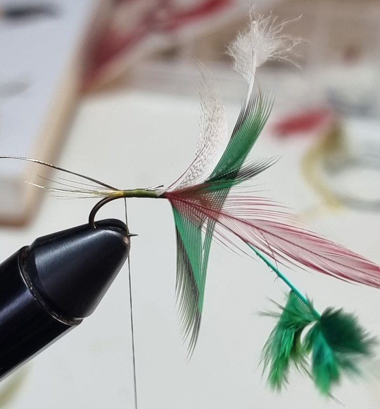 Hackles: one turn of a french partridge hackle dyed green olive, followed by an turn of grey mallard in front and then blue jay ‘at the throat’