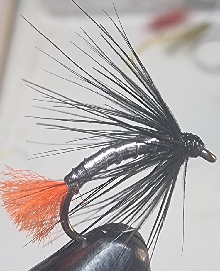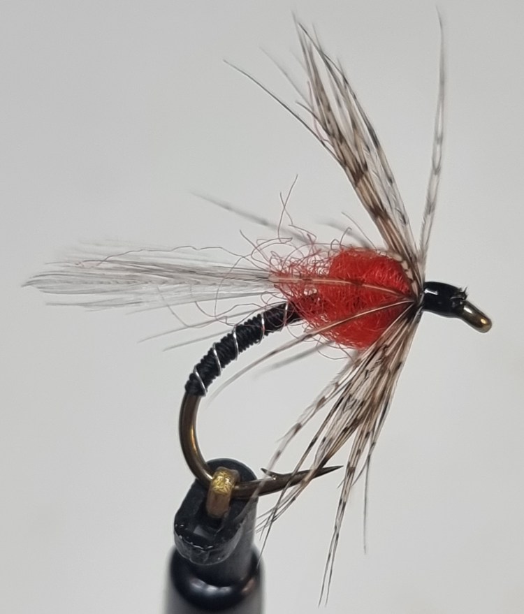 Leonards Duckfly, a pattern designed by Cyril Conlon, used to be hugely popular on the Corrib but I haven’t seen anyone use it for ages. Again, a B110 hook is used, and black tying silk. The abdomen is flat silver tinsel over wound with clear polythene. I add a rib of fine silver wire to give the weak polythene a bit of protection. A short wing made from grey squirrel tail hair is tied in behind the thorax which is made of three turns of black ostrich herl and then three turns of red ostrich herl. The original had a head of red varnish, but I either don’t bother with that or I wind on and whip some GlowBrite no.4 floss instead. Hook sizes are 14 to 10.