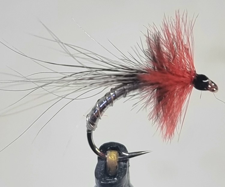 The Silver Spider can be tarted up a bit by adding a fire orange yarn tail and it will work. I tie this one on a Kamasan B110 hook in sizes 10 to 14. Just a silver body with a black hen hackle and the yarn tail.