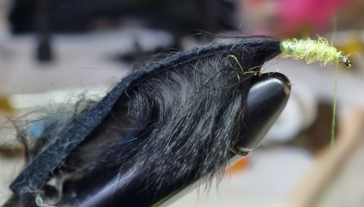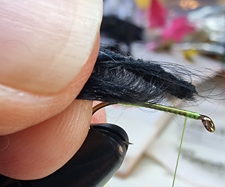 Dub the tying silk with your chosen synthetic dubbing and form a body by winding back up the hook, leaving a space at the eye for tying in the rabbit.