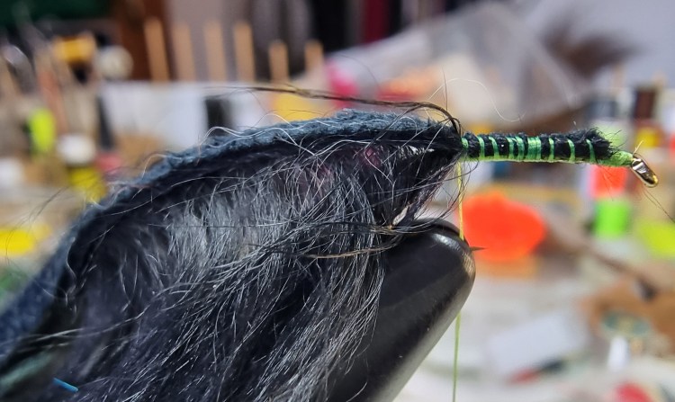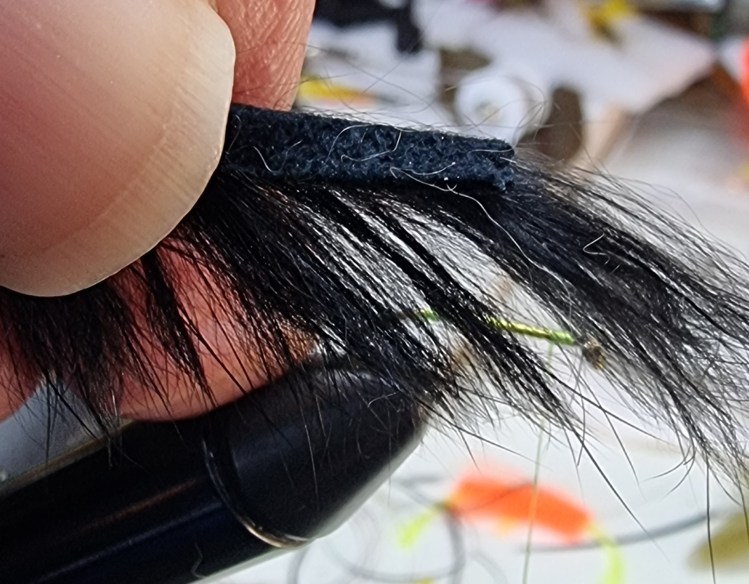 With the hair now pointing to the bend end of the hook, offer up the strip and catch it in on top of the hook with the tying silk. One loose turn and then further tight ones works best.