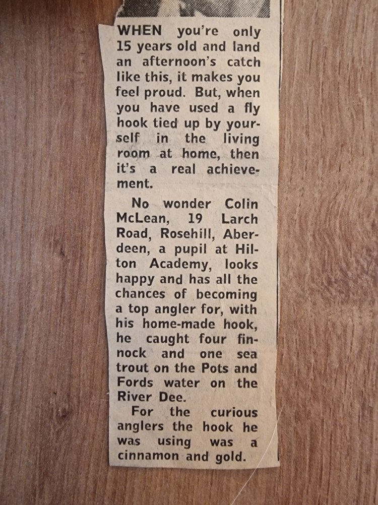 When I was in Aberdeen last week my mother gave me some old photographs which were gathering dust in a drawer. In amongst the usual embarrassing pictures of me as a long haired teenager was one taken of me and published in the local paper. It was taken when I was 15 years old and featured a fresh-faced me is holding up a catch of sea trout beside the river Dee. The photographer wanted me to hold up the fish but I could not keep the slippery trout in my hands so I strung them on a stick. I caught those sea trout on a Cinnamon and Gold!