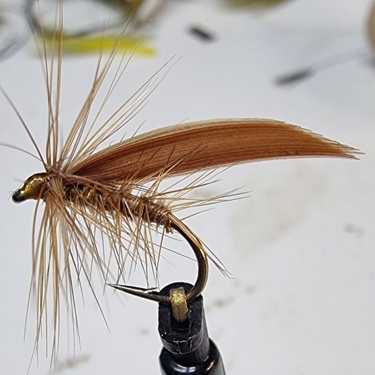 Arguably even more popular than the Cinnamon and Gold is the Cinnamon Sedge. A fair copy of the natural, this is a lovely fly to tie. The body is usually made from seal or other fur these days but I still use cinnamon turkey herls. You can use turkey for the wings too but I like to use hen quills and save the turkey just for the bodies. Normal tying is herl body ribbed with fine gold wire and a body hackle consisting of a palmered ginger cock hackle. Cinnamon quills for the wings are tied long and low over the back and a head hackle the same as the body hackle but a bit longer in fibre finishes off the fly. The natural cinnamon sedge is one of the more common species here in Ireland, so an artificial is pretty much essential for both river and lough anglers. You can go as big as a size 10 for the lough but a 12 or 14 is much better on running water.