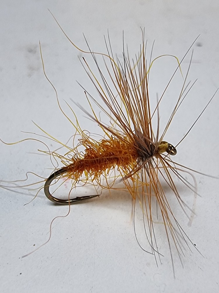 One last use for the colour cinnamon is Bob’s Bits. Like many of you, I tie and fish ‘the bits’ in many colours, but cinnamon is a consistently good shade for me. Ultra easy to tie, it is just a cinnamon dyed seal’s fur body with a couple of turns of a ginger hackle which is clipped underneath, on a size 12 hook. Despite the crude nature of this dry fly it is reliable for those difficult calm summer days on the lough. I have a suspicion the trout might take this as a hatching sedge, the rough outline and messy profile might be like the confusion of legs and body parts as a caddis struggles on the surface. Whatever they take it for, a Cinnamon Bits is a cracking dry fly. You can tart it up a bit by adding a few legs made of knotted cock pheasant tail herl or a wing of yarn to help you see the damn thing on a choppy day.